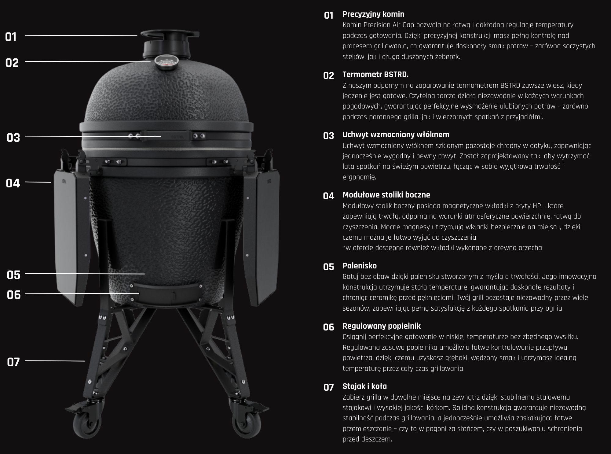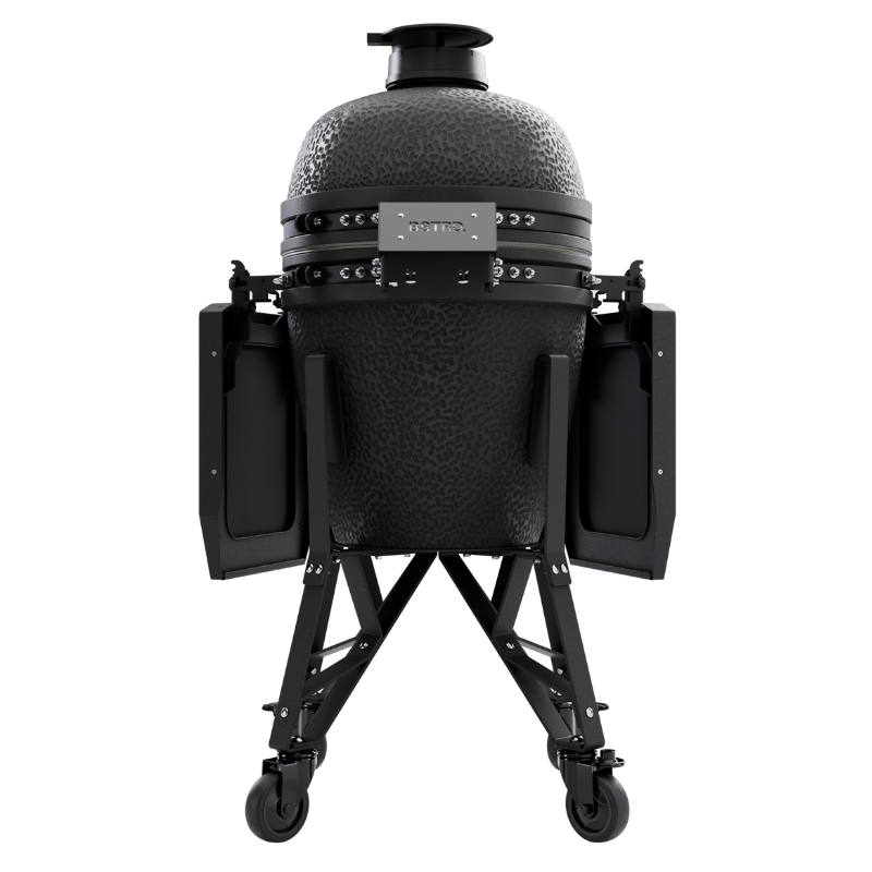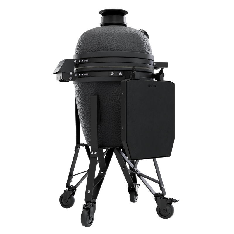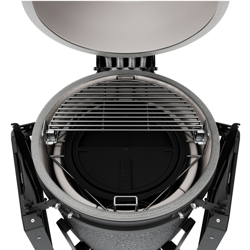 Grille BSTRD.PRO zostały stworzone, aby zapewnić maksymalną wygodę i precyzję. Dzięki nowej nasadce powietrznej z silikonowym uchwytem i mechanizmem szybkiego podwyższania temperatury, ulepszonemu termometrowi z wyraźnymi odczytami oraz wzmocnionemu uchwytowi odpornego na każdą pogodę, obsługa jest jeszcze prostsza. Modułowy stolik boczny, dynamiczny deflektor i dzielona komora paleniskowa zwiększają funkcjonalność i kontrolę nad procesem grillowania, a zoptymalizowana podstawa z wysokiej jakości kółkami zapewnia mobilność i stabilność.