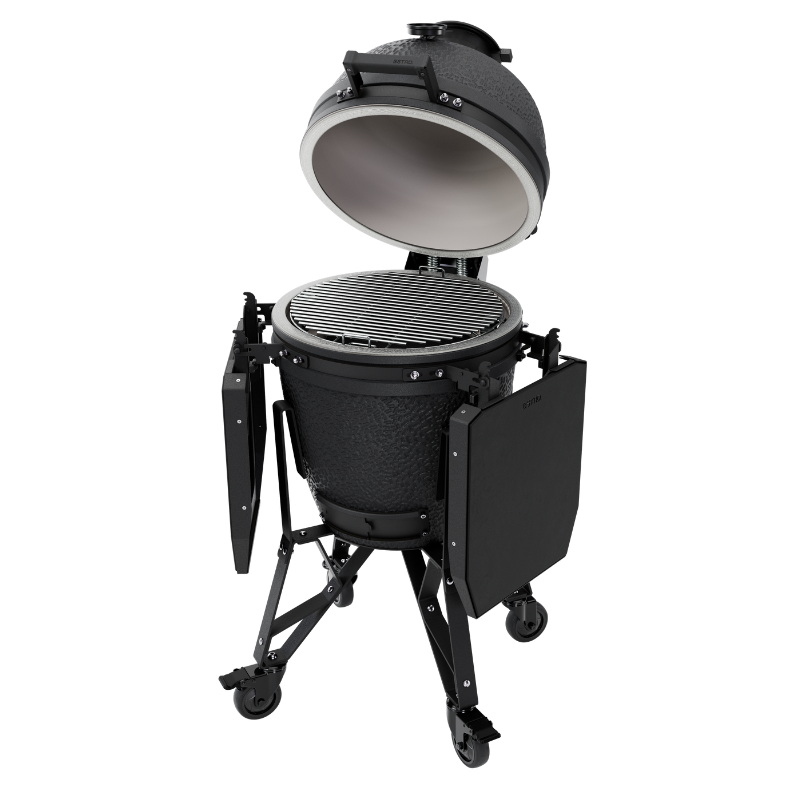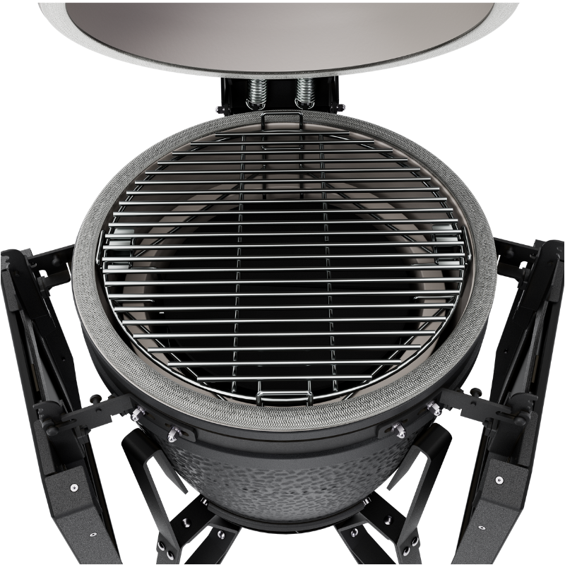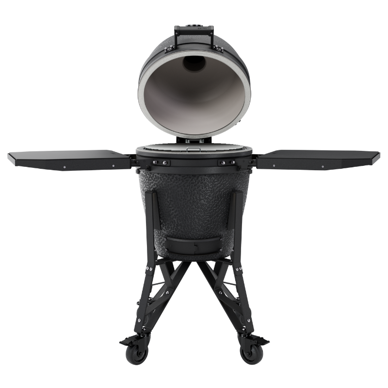 Nowa nasadka powietrzna z silikonowym uchwytem pozwala łatwo kontrolować temperaturę, a ulepszony termometr gwarantuje wyraźne odczyty bez parowania. Wzmocniony uchwyt z nylonu z dodatkiem włókna szklanego jest wyjątkowo trwały i wygodny w każdą pogodę. Modułowy stolik boczny z magnetycznymi wkładkami HPL zapewnia praktyczną przestrzeń roboczą, odporną na warunki atmosferyczne. Elegancka przepustnica z lepszym uszczelnieniem ułatwia zarządzanie ciepłem i dymem, a nowa podstawa z wysokiej jakości kołami sprawia, że grill jest mobilny i gotowy do działania od razu po złożeniu.