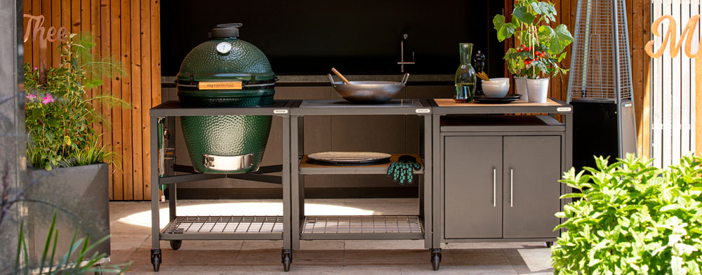 Czy masz Big Green Egg Large lub XLarge, a może MiniMax ? Rozpocznij od ustawienia ramy i powoli rozszerz ją za pomocą regałów, półek i innych dodatków. Jeśli potrzebujesz dużej powierzchni roboczej, modułowy system jest tak samo wszechstronny jak sam EGG. Konfigurację oraz twój styl miejsca pracy na zewnątrz można również dostosować do własnych upodobań i wymagań.