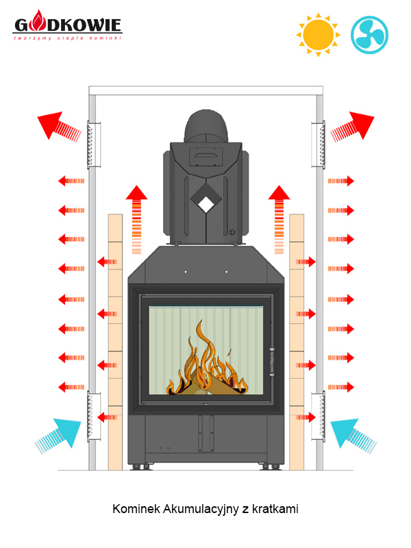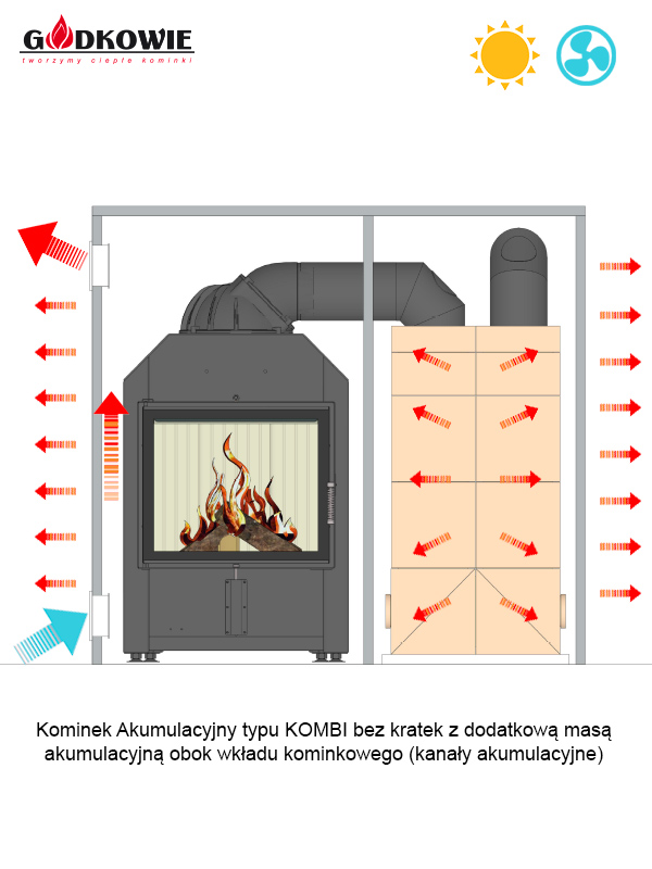 Kominek Akumulacyjny typu KOMBI bez kratek z dodatkową masą akumulacyjną obok wkładu kominkowego (kanały akumulacyjne)