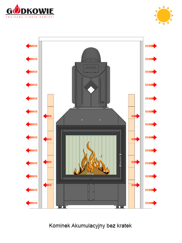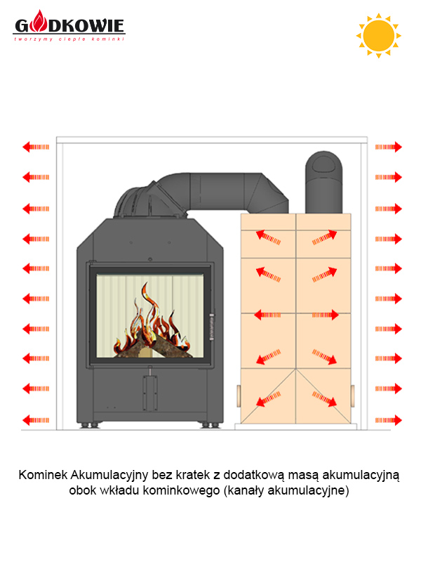Kominek Akumulacyjny bez kratek z dodatkową masą akumulacyjną obok wkładu kominkowego (kanały akumulacyjne)
