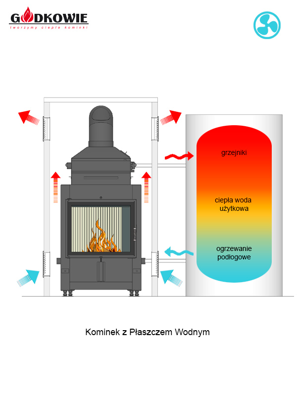 Zalecany do połączenia wkładu z płaszczem wodnym z funkcjonującą już instalacją jest zbiornik akumulacyjny (bufor) kominka, który gromadzi nadwyżkę ciepłej wody. Woda ta jest przekazana do sytemu grzewczego wtedy, gdy nie pali się w palenisku. Ważne jest, aby temperatura powrotna do wkładu kominkowego miała 55°C. Elegancką obudowę można wykonać z płyt keramzytowych.