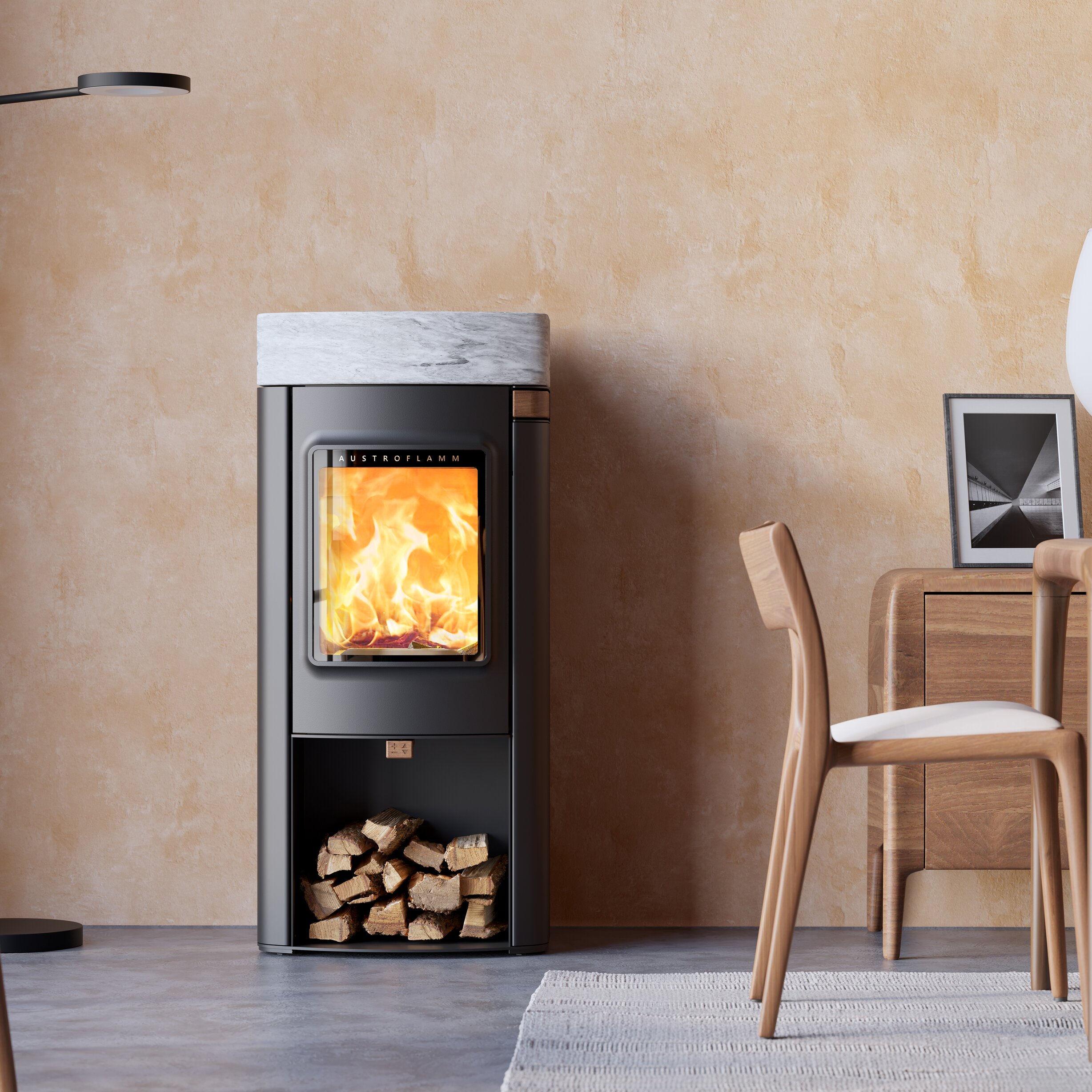Wkład paleniska wykonany jest z opatentowanego przez Austroflamm Keramott, który w połączeniu z zaawansowanym systemem doprowadzania powietrza zapewnia sprawność ponad 80%. Oczywiście każdy piec Austroflamm spełnia wszystkie aktualne normy emisji spalin i posiada wszelkie niezbędne certyfikaty.