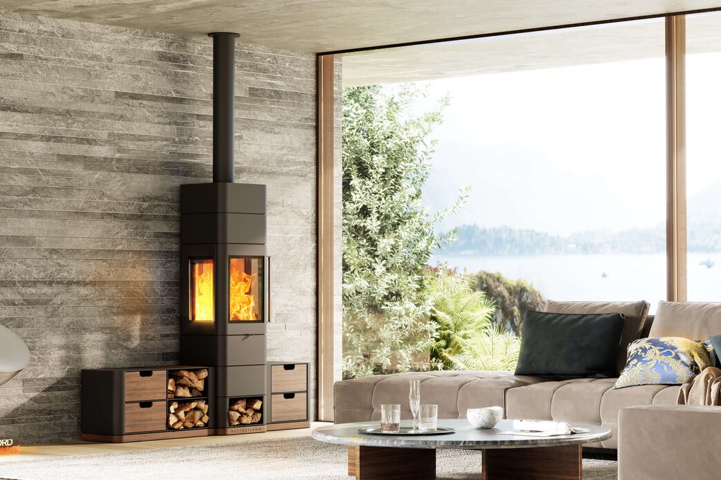 Prosta linia z prostokątną powierzchnią podłogi traci swoją surowość dzięki zaokrąglonym narożnikom, ale nie traci na ostrości i elegancji. Dzięki różnorodnym możliwościom rozbudowy, Ivy 2.0 staje się nie tylko piecem, ale także meblem i centralnym punktem, łącząc funkcjonalność z formą. Trójstronne wstawki okienne otwierają widok na płomienie, idealnie je osadzając.