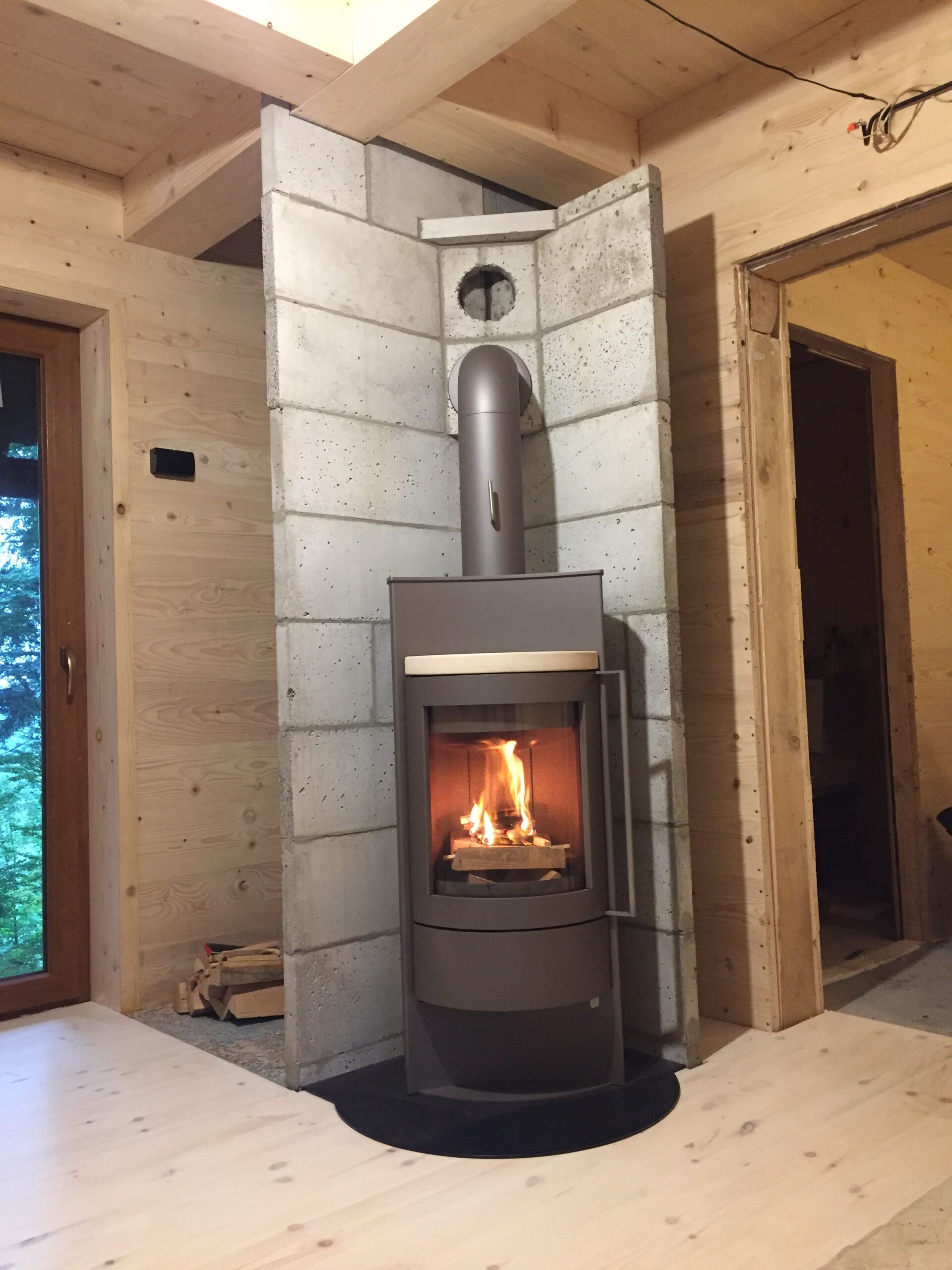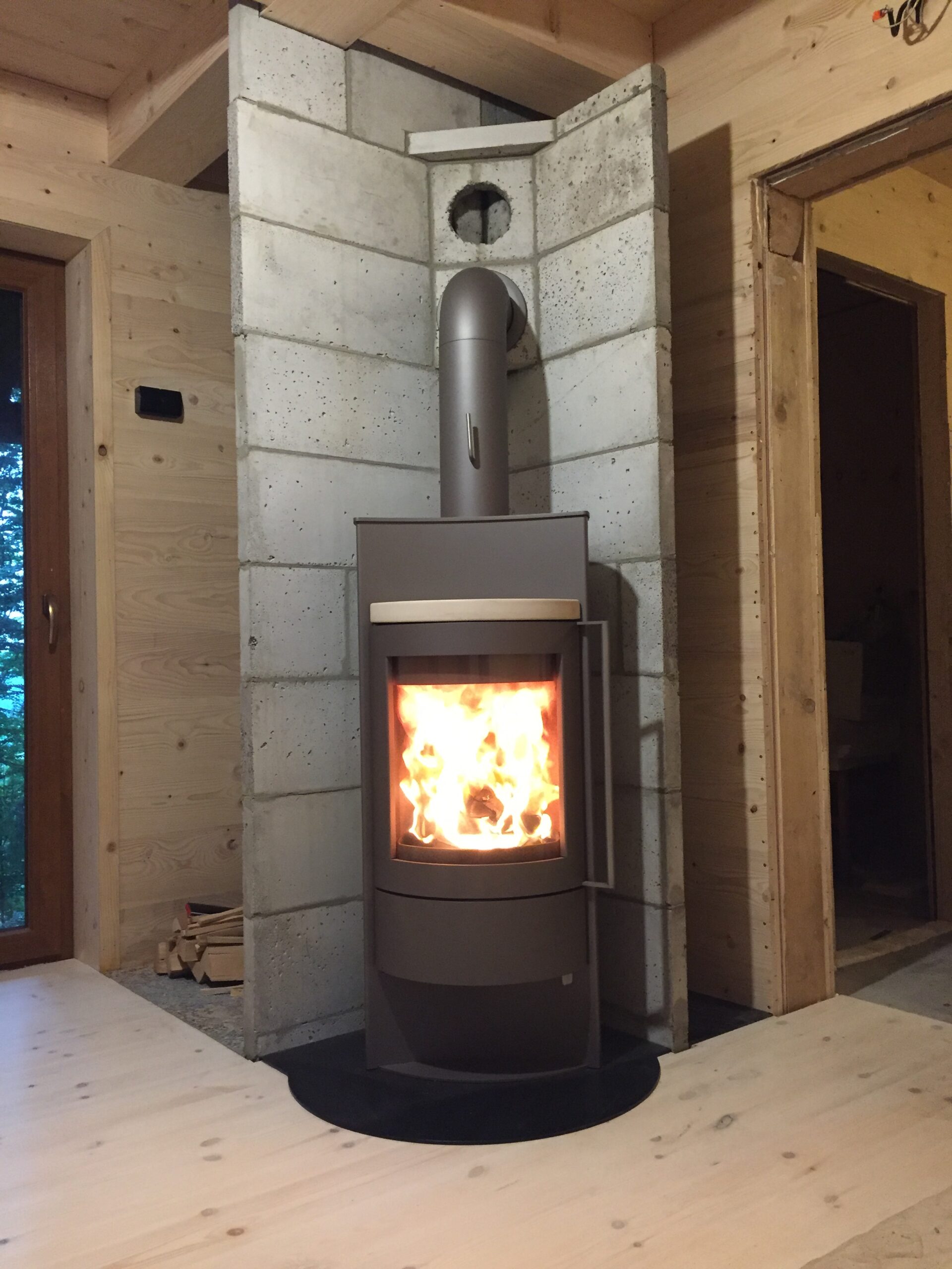 Piec kominkowy Hase stalowy srebrnoszary podłączony do komina ceramicznego.