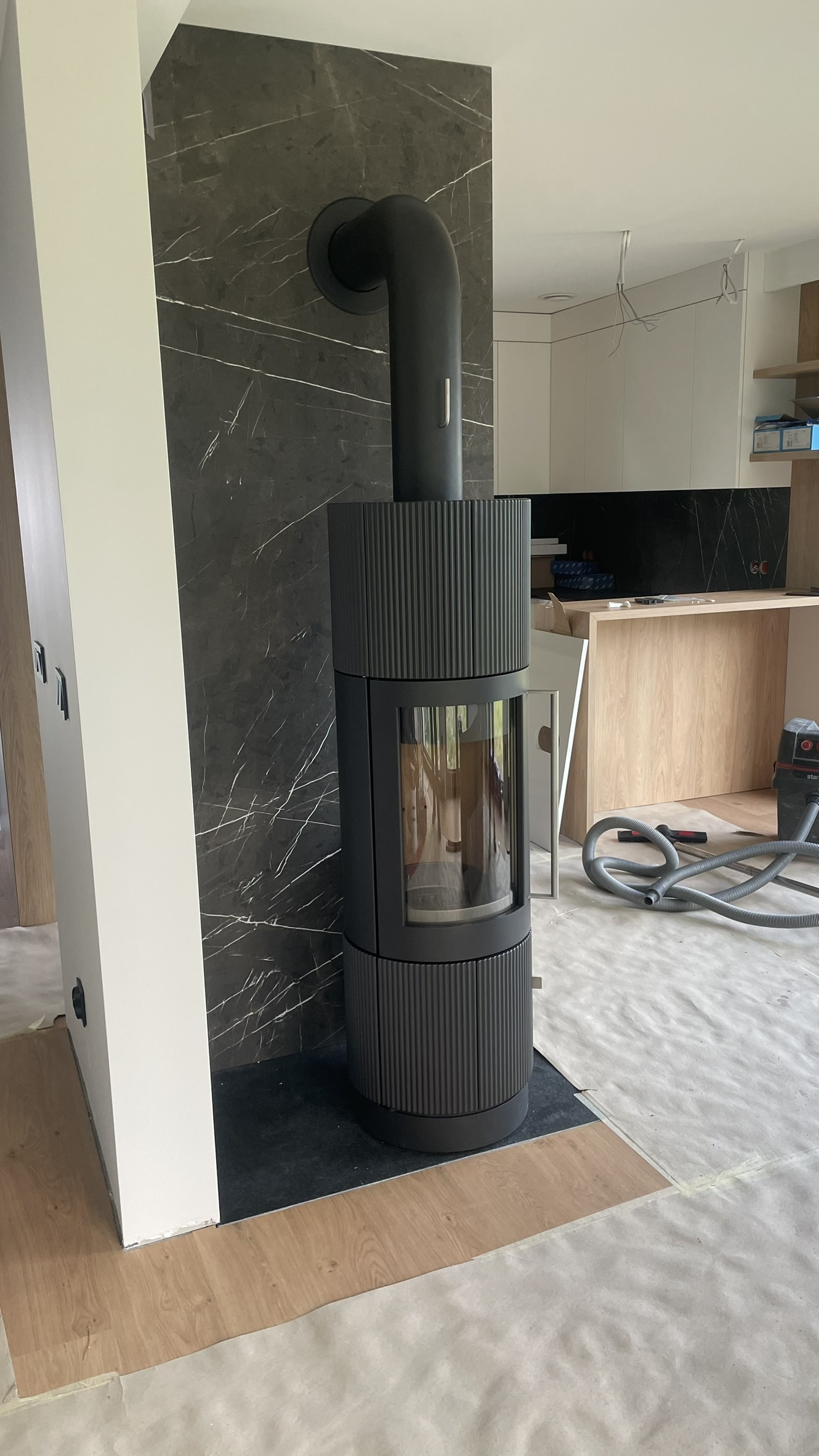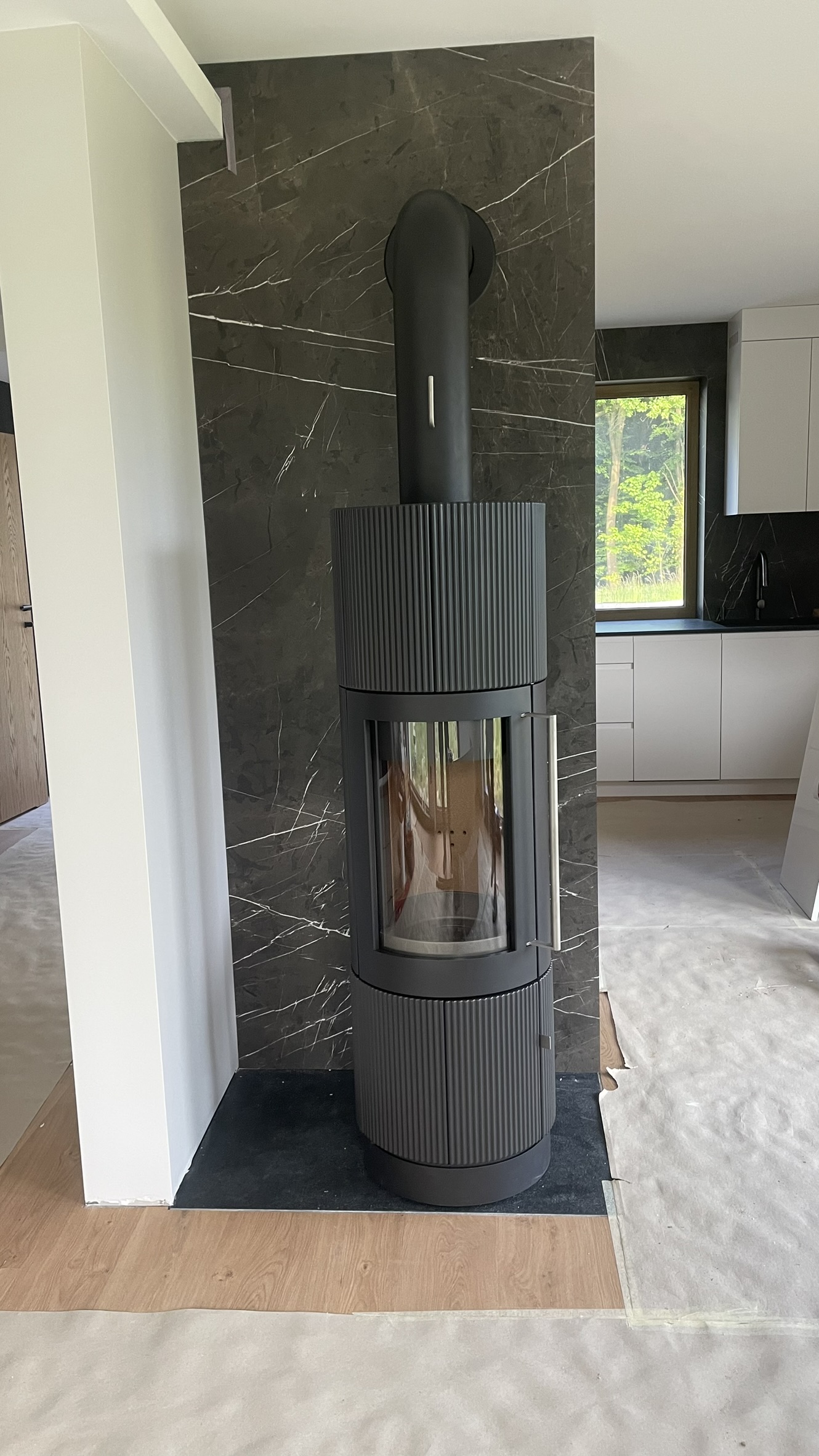 Piec kominkowy Hase Osaka stalowy czarny w ceramice Montagne podłączony do komina ceramicznego.