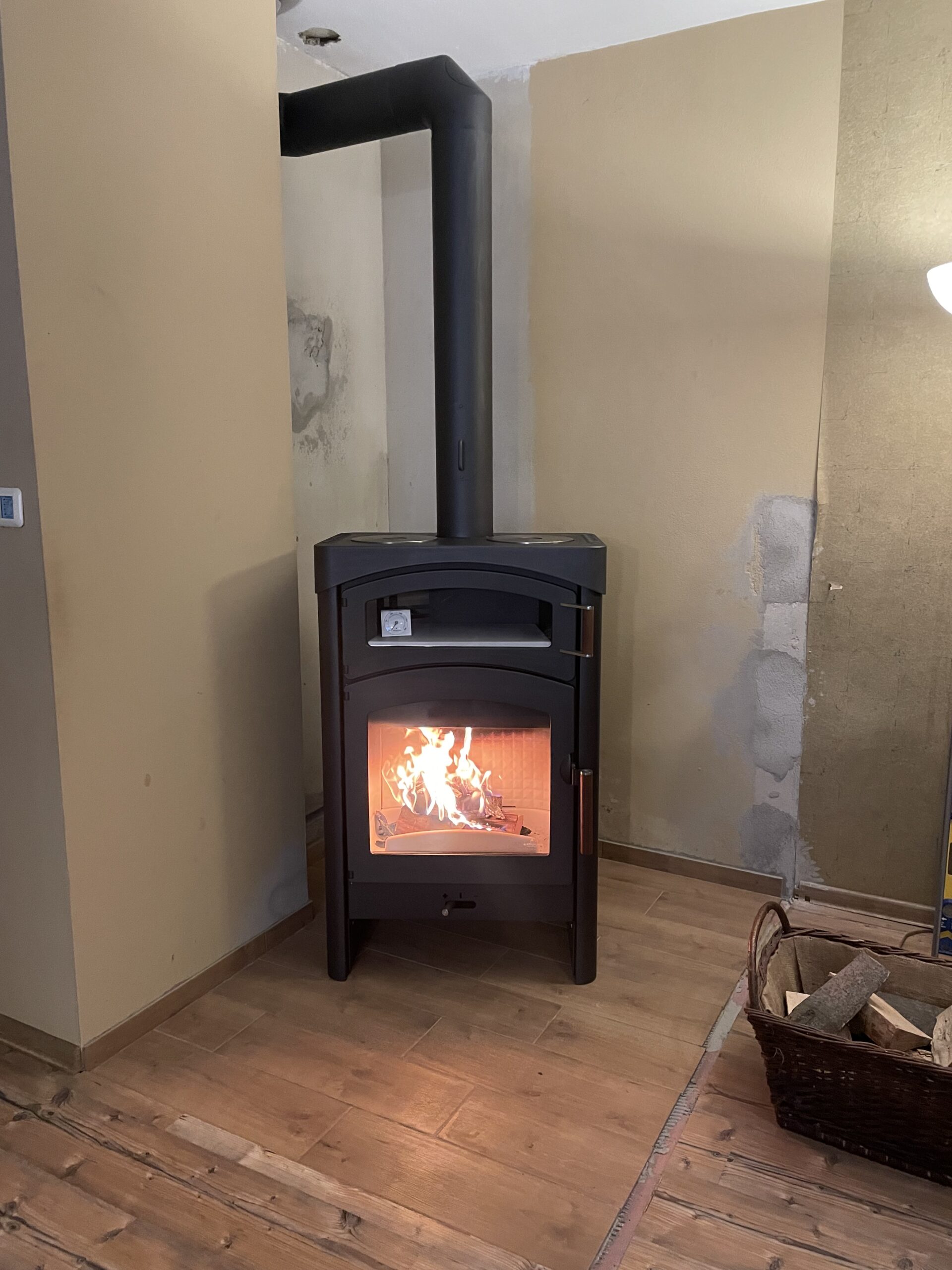 Piec kominkowy Austroflamm Pallas Back z dodatkową akumulacją, podłączony do komina ceglanego.