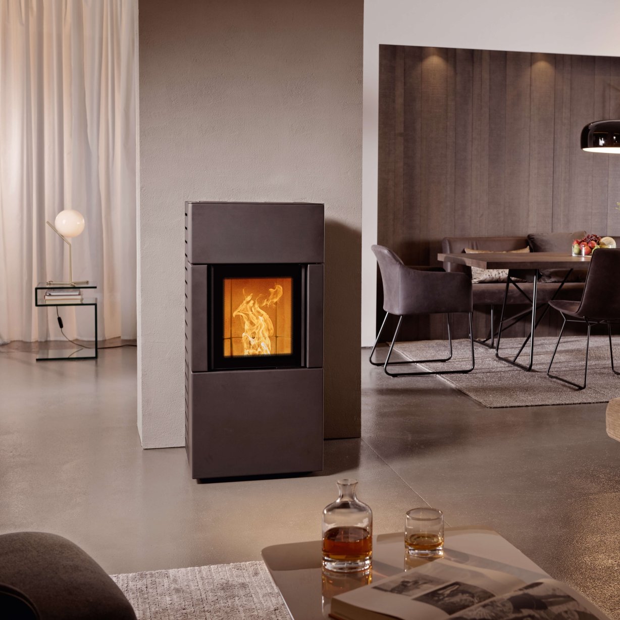 Ten piec na pellet wyróżnia się wyrafinowanymi elementami stylistycznymi, od delikatnej ceramicznej obudowy po stylowy drewniany uchwyt. Eleganckie, zaokrąglone żeliwne drzwiczki spektakularnie eksponują płomień. W zależności od potrzeb, jako akcesoria można wybrać różne opcje podłączenia przewodu kominowego (z tyłu lub z góry) oraz moduł rozdzielacza powietrza.