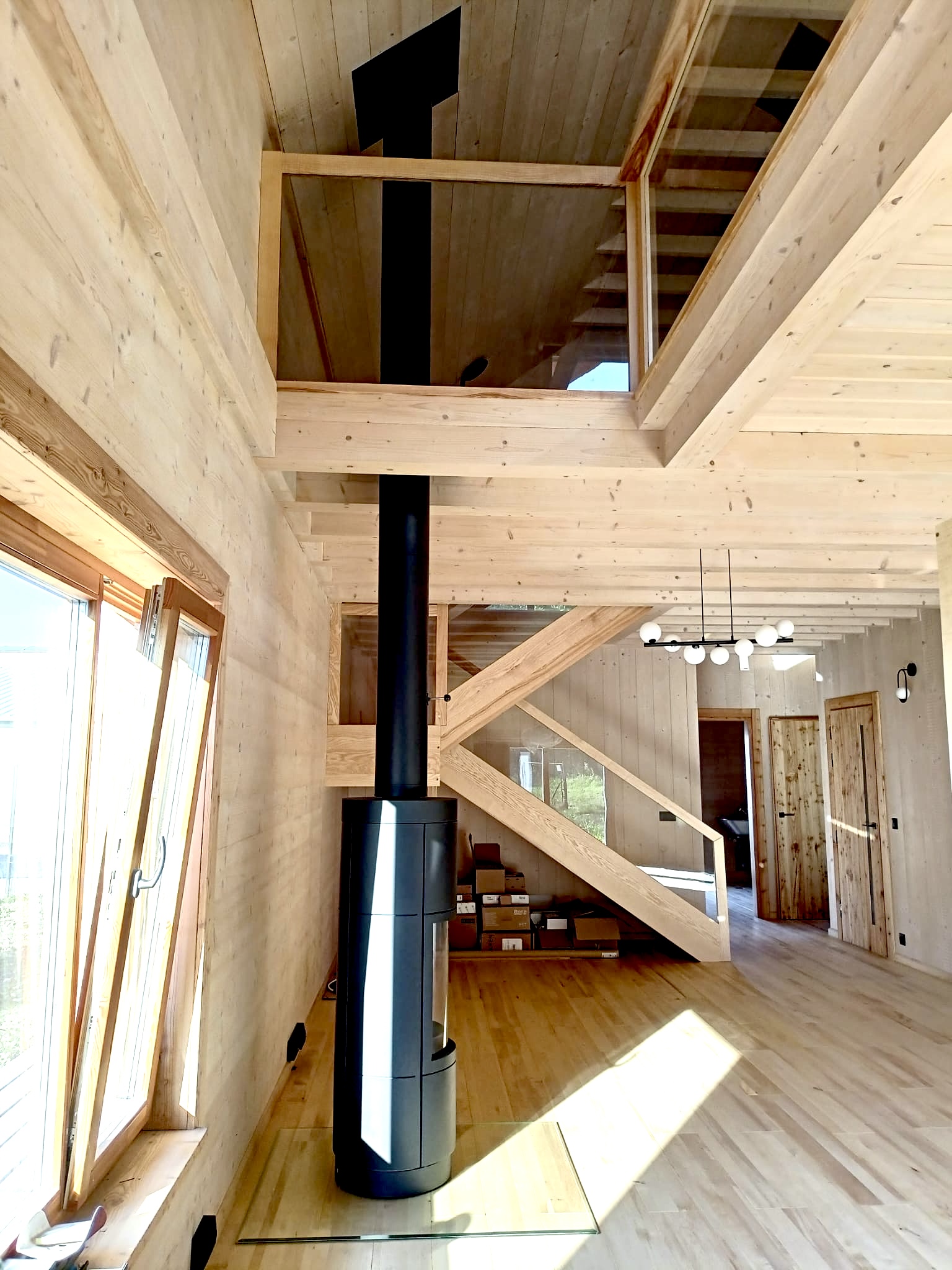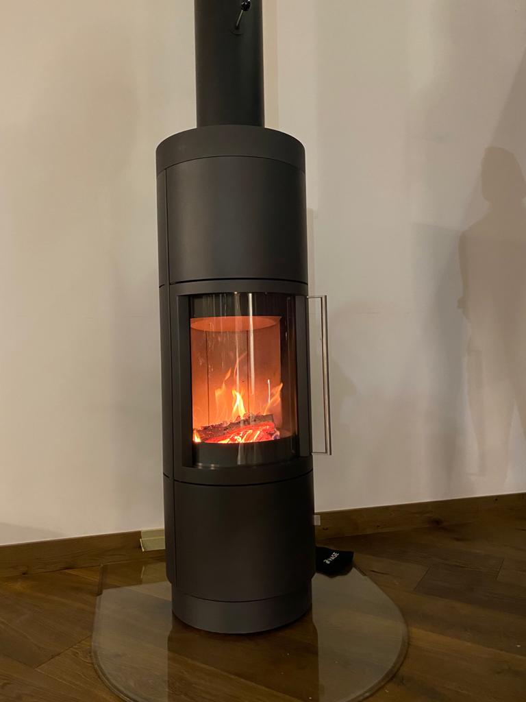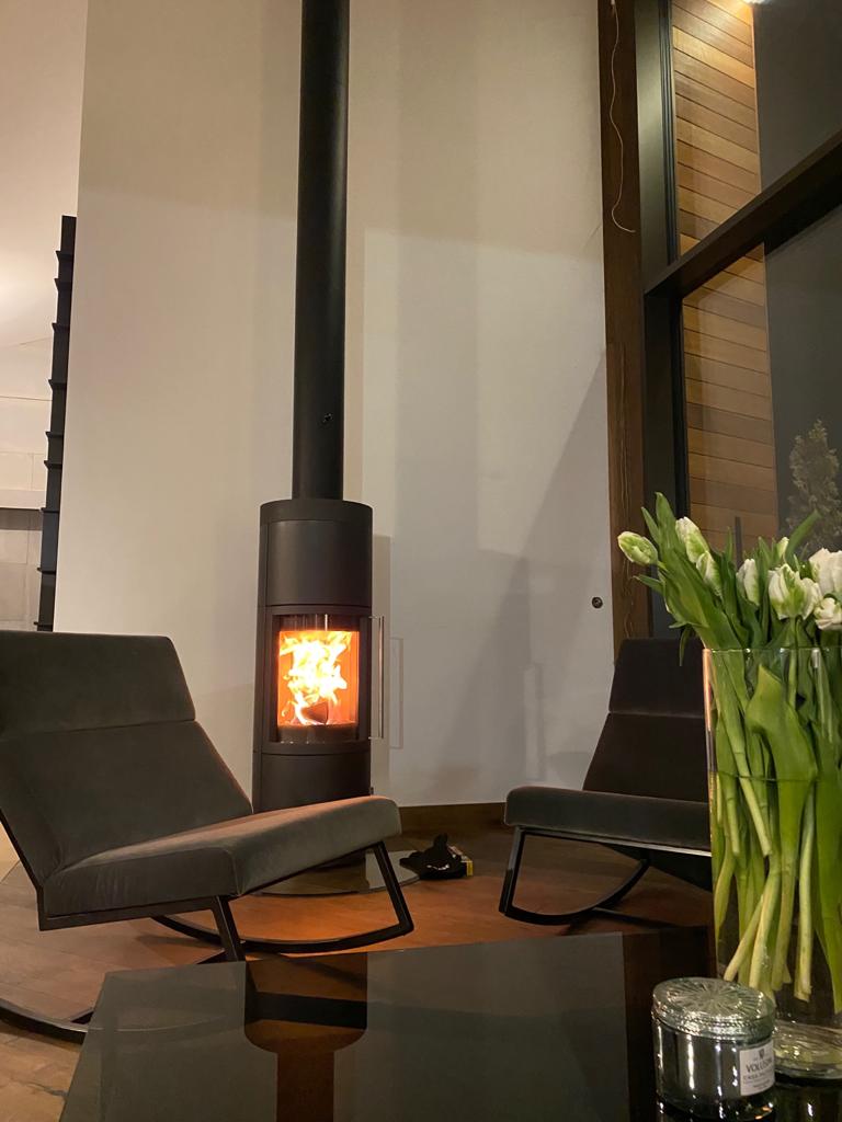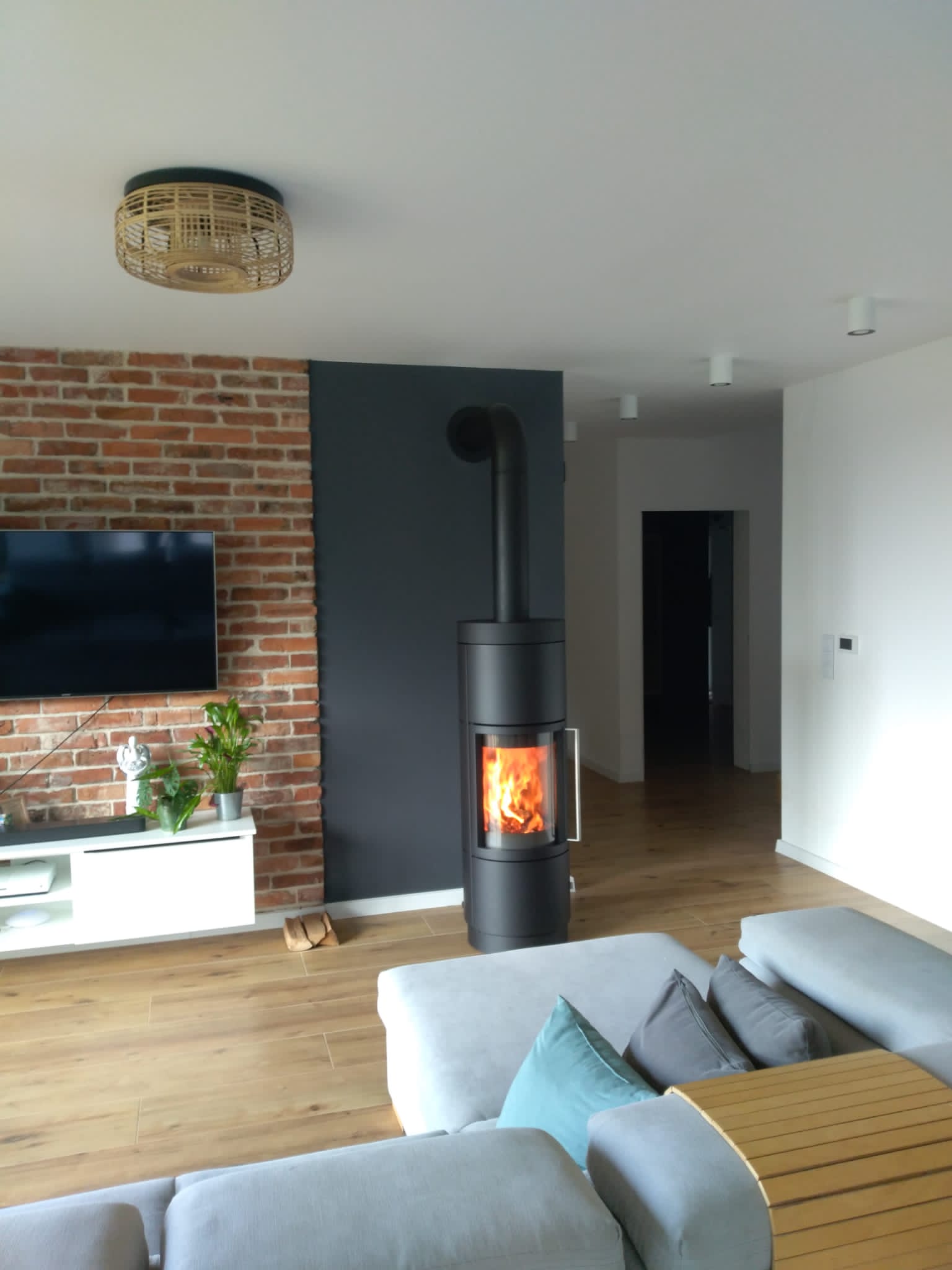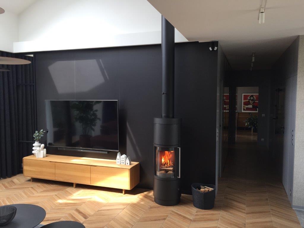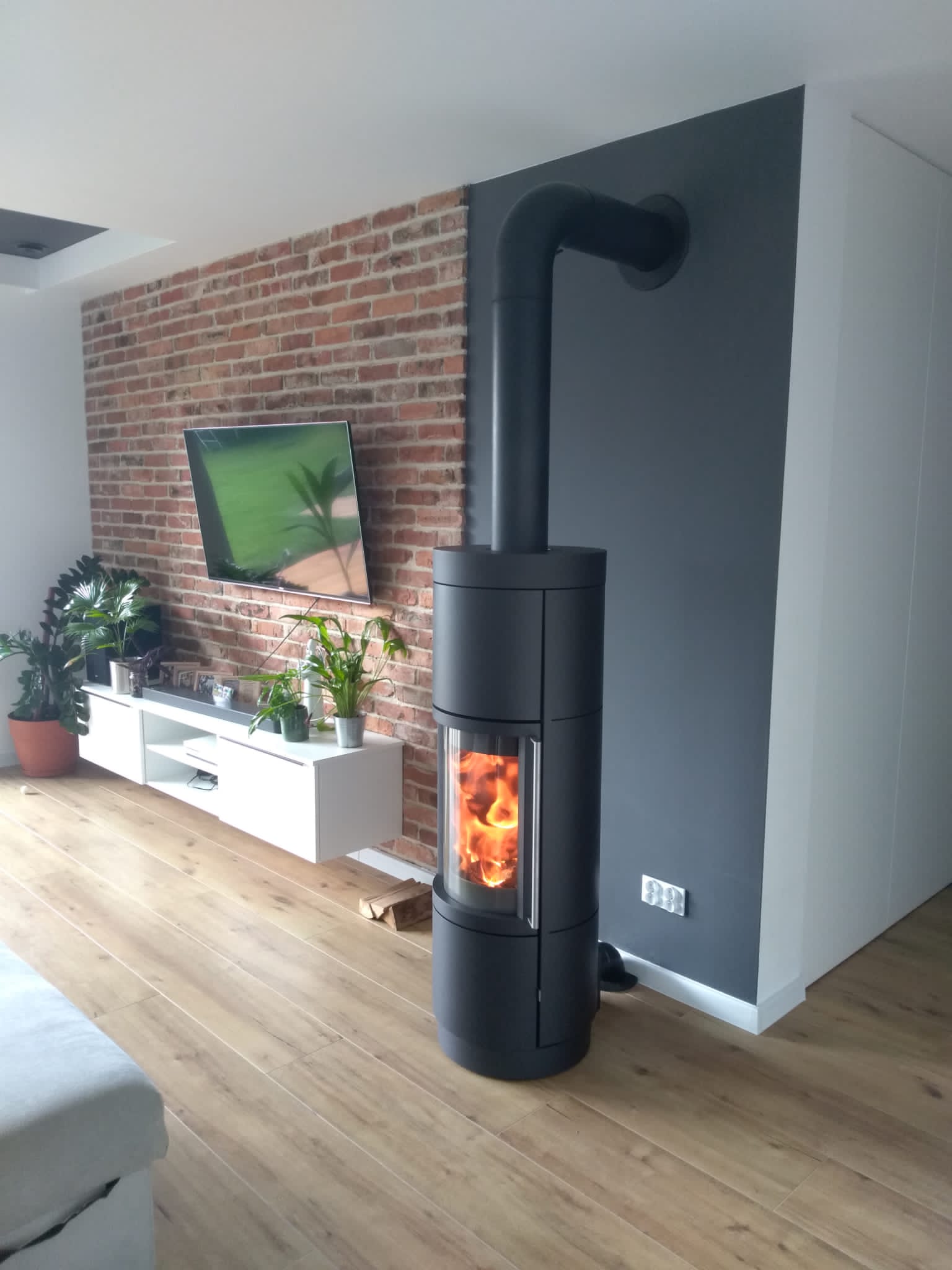 Akumulacyjny piec kominkowy Hase Sila Plus iQ (automatyczne sterowanie powietrza do spalania) podłączony do stalowego komina Jeremias DW-Vision