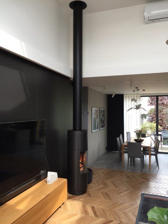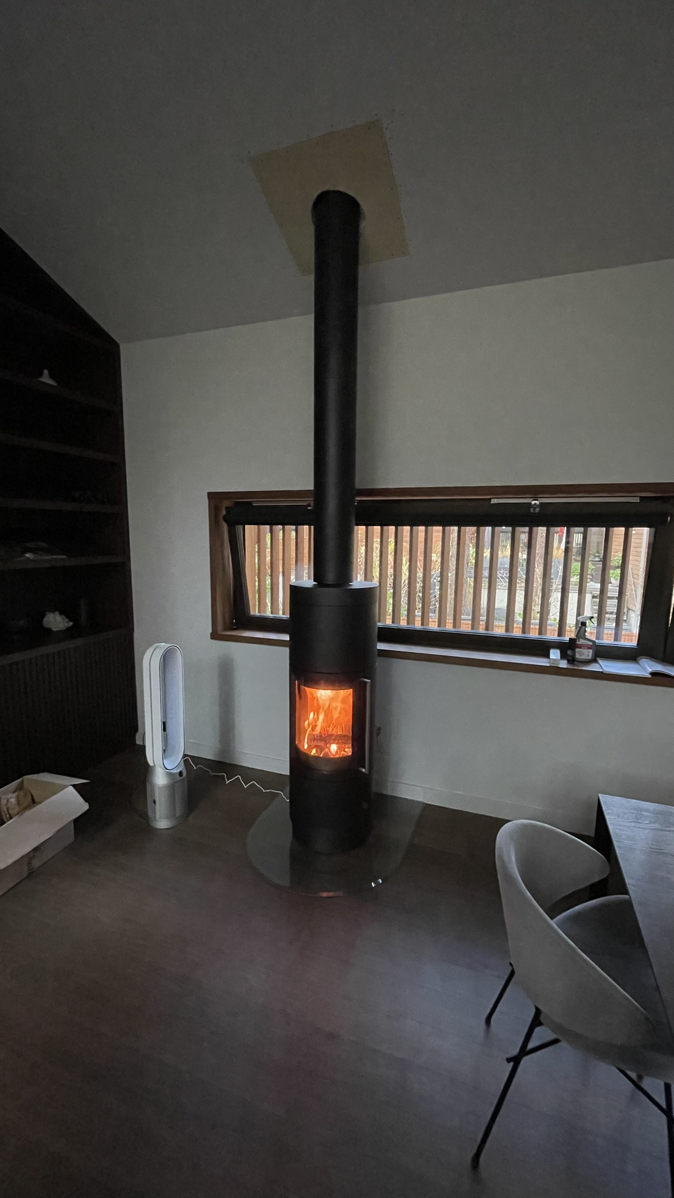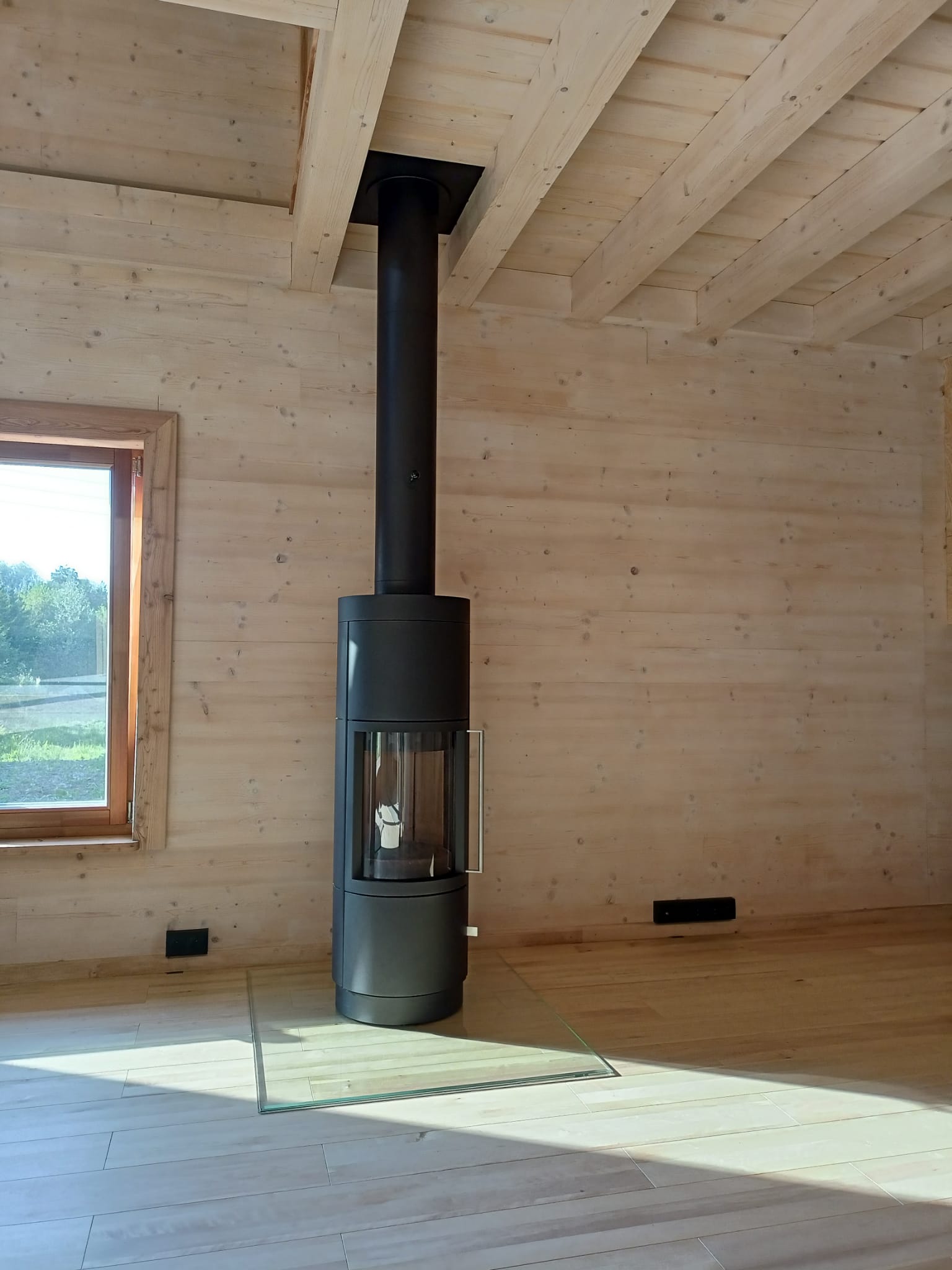Akumulacyjny piec kominkowy Hase Sila Plus podłączony do stalowego komina Jeremias DW-Vision