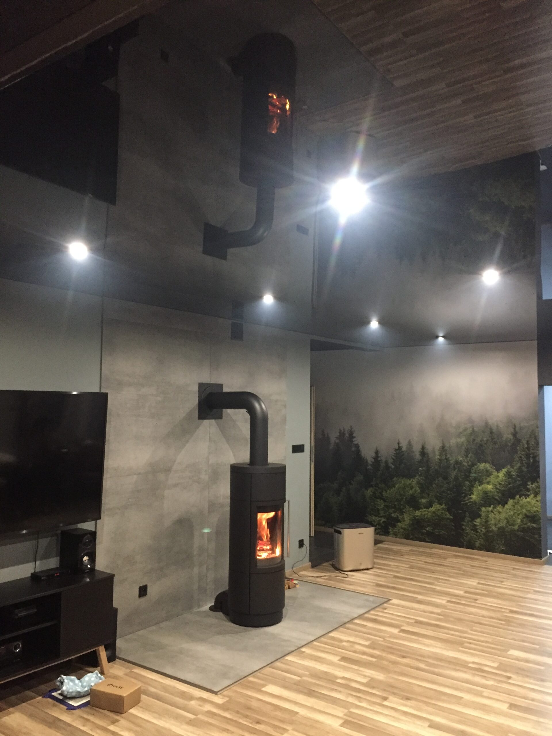 Piec kominkowy Hase Sila w kolorze czarnym z dodatkową akumulacją podłączony do komina ceramicznego.