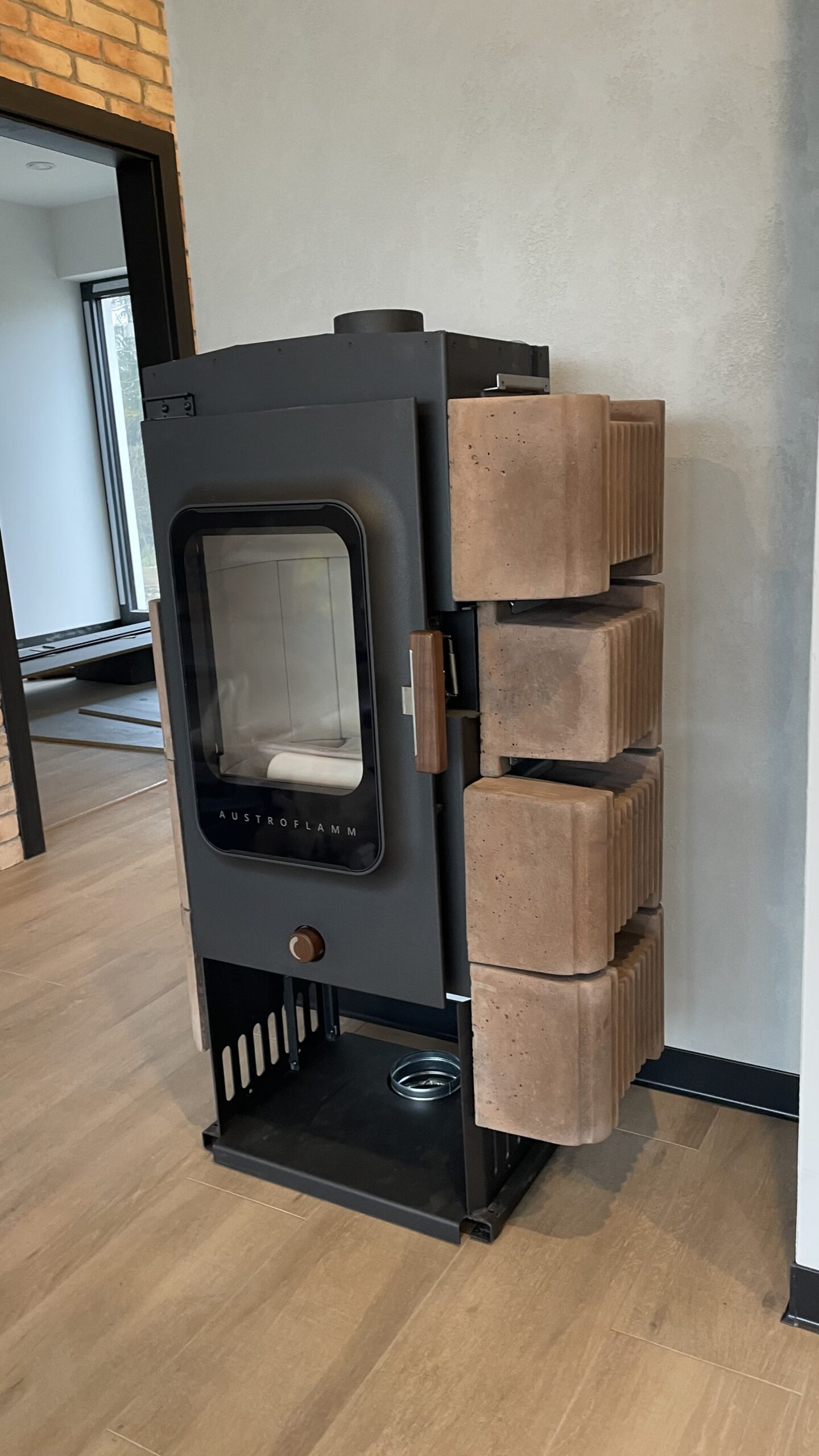 Piec kominkowy Austroflamm Sina Xtra podłączony od góry do komina ceramicznego.